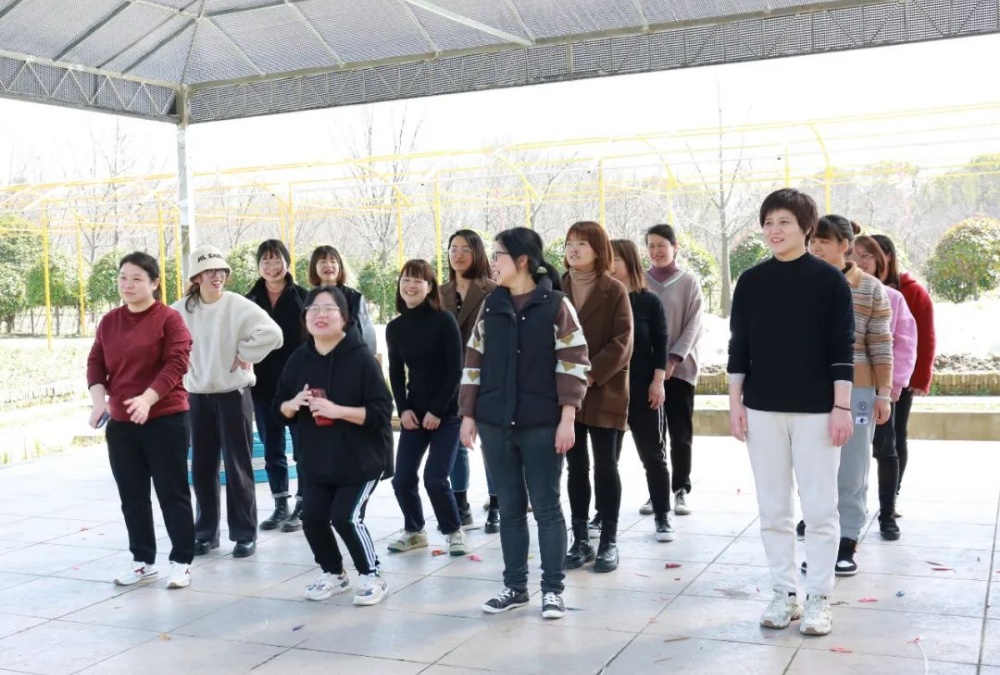 首先圍成了一個圈,共分為四組,每組隊員都給自己的組別取了有趣的名字:櫻桃、蘋果、西瓜、菠蘿。游戲開始了,第一組(櫻桃)喊:櫻桃蹲櫻桃蹲,櫻桃蹲完菠蘿蹲……淘汰的組別派一個代表做出懲罰,外貿(mào)部魏禮紅說的笑話讓大家捧腹大笑,質(zhì)檢部吳琳玲演唱了一首歌曲《愛的奉獻(xiàn)》。