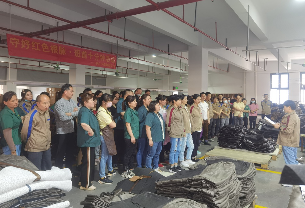 4月8日剛上班,卡雷諾公司縫紉車間組織開展班前會,把黨的二十大精神、全國兩會精神等內容簡要宣傳貫徹到車間全體員工中,讓基層員工了解國家時政,把握發(fā)展大局;同時圍繞近期工作,對員工開展安全生產、產品質量、反詐宣傳等;鼓勵員工專研技能提升,做新時代工匠。