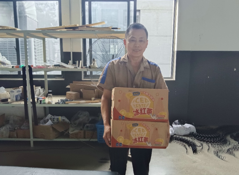 漢林公司每位員工在領(lǐng)到了毛巾和香皂的基礎(chǔ)上,于7月10日又領(lǐng)到了每人二箱的冰紅茶。